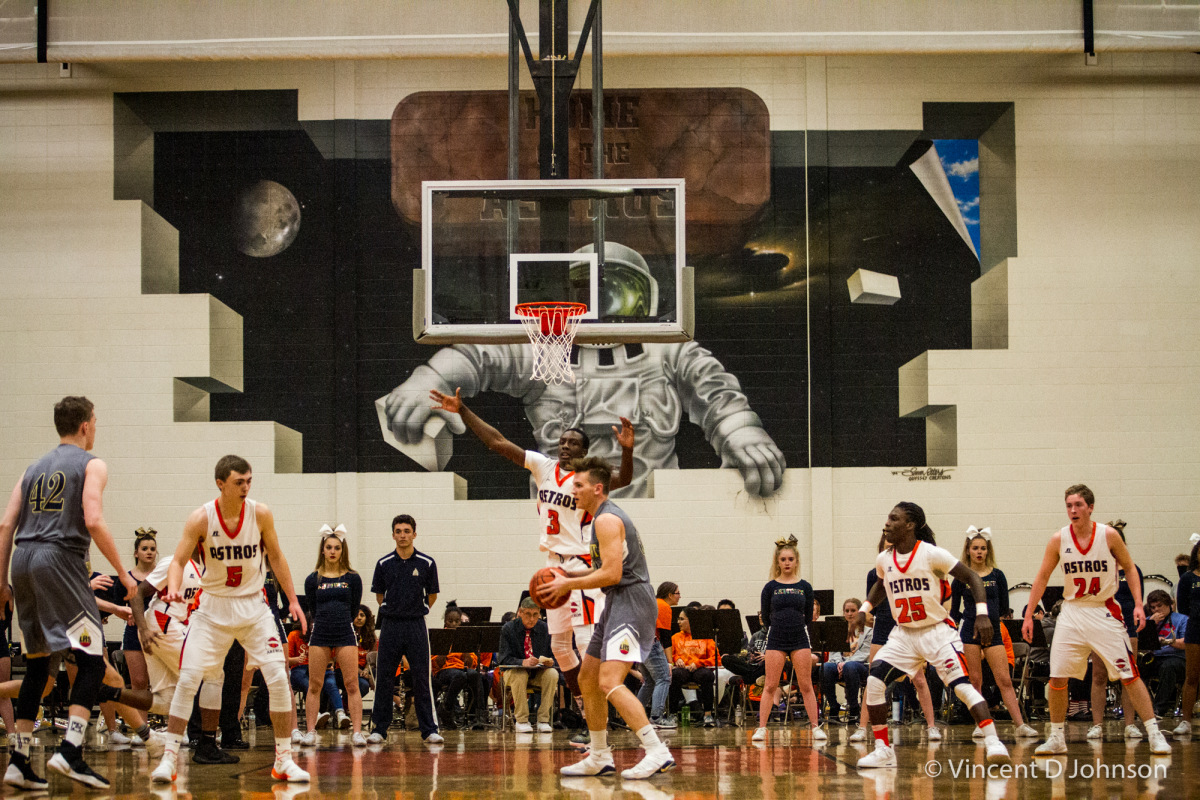 Caption: Illinois varsity high school boys basketball game between the Astros of Shepard from Palos Heights and the Titans of Tinley Park, at Tinley Park on Friday, December 7, 2018.