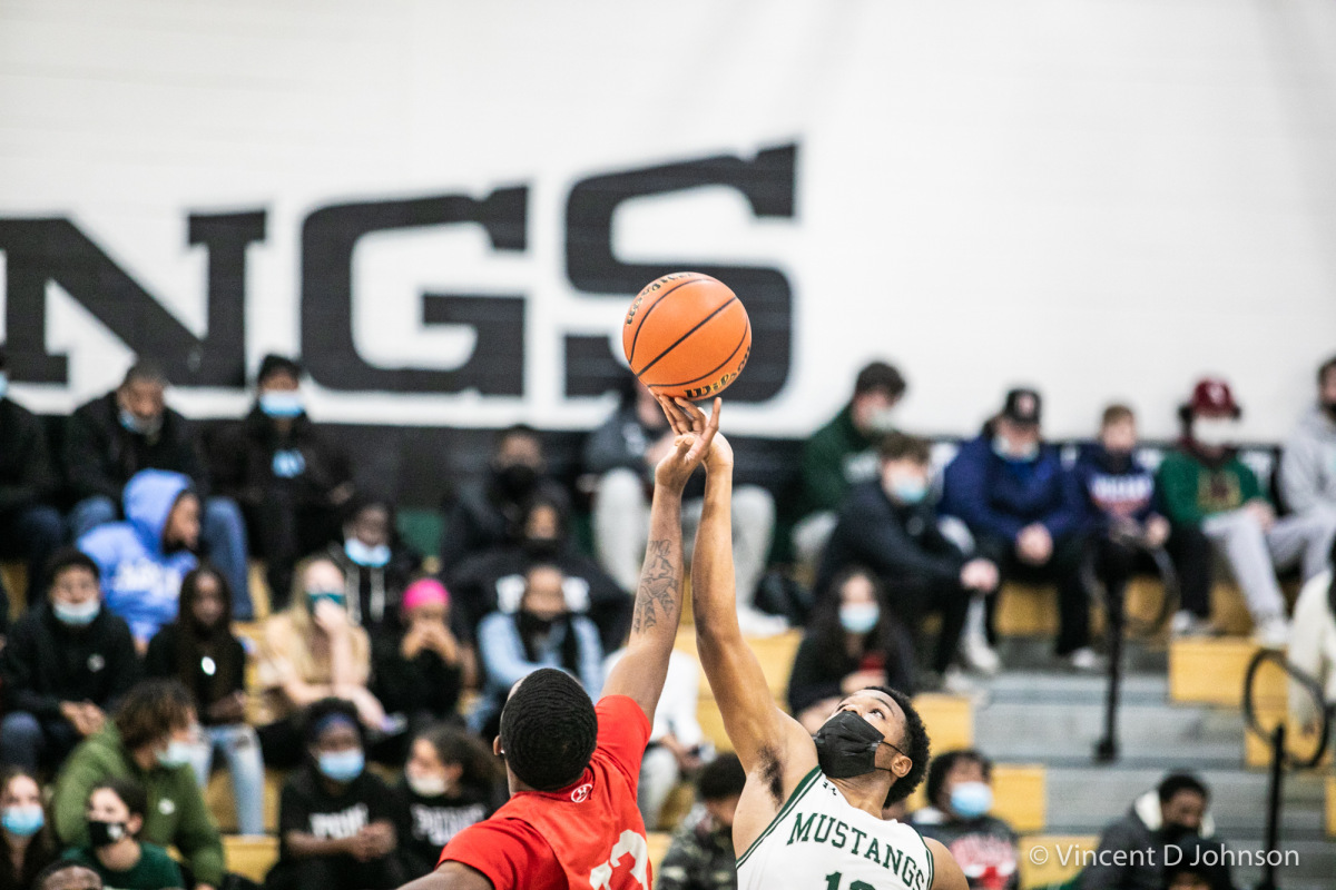Caption: Illinois varsity high school boys basketball game between T.F. South from lansing and the Mustangs of Evergreen Park, in Evergreen Park on Thursday Dec. 2, 2021 (Vincent D. Johnson)