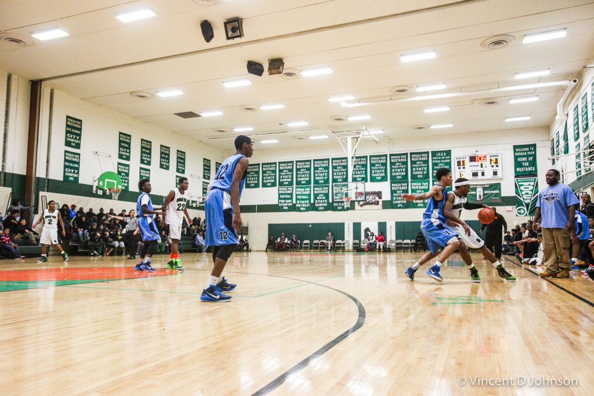 Illinois high school boys varsity basketball game between the Mustangs of Morgan Park from Chicago and the Wolverines of Simeon from Chicago, Thursday, January 24, 2019, in Chicago. (phot by Vincent D. Johnson).
